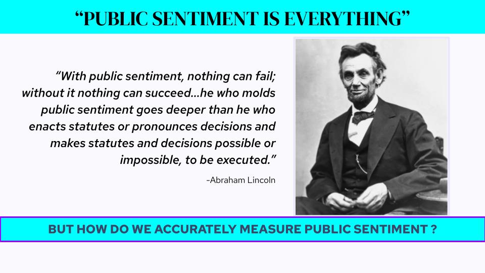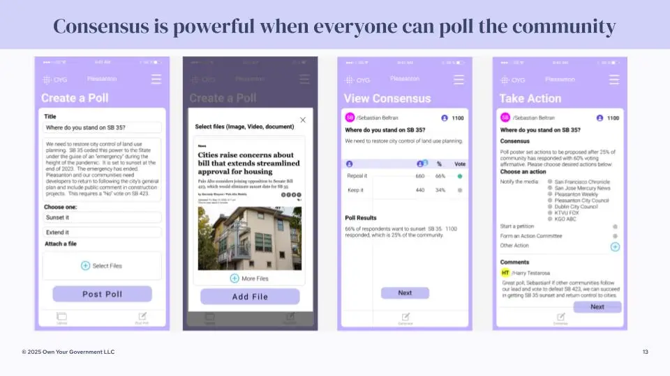 Every registered member on a community platform may post a poll to the community. When responses to the poll reach a statistically relevant threshhold, consensus is reported to media, and government officials.