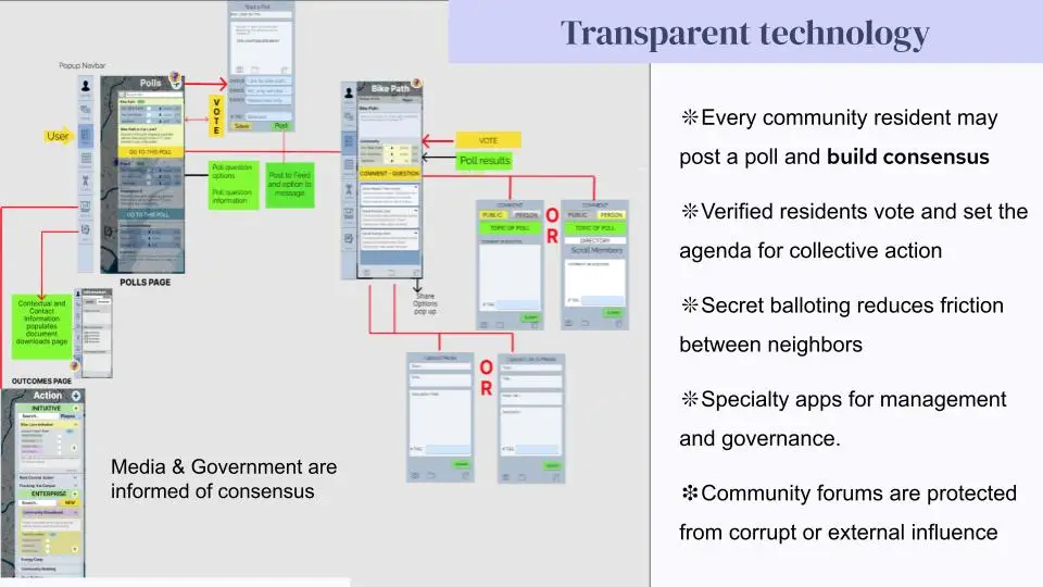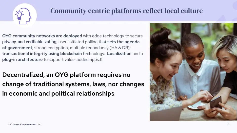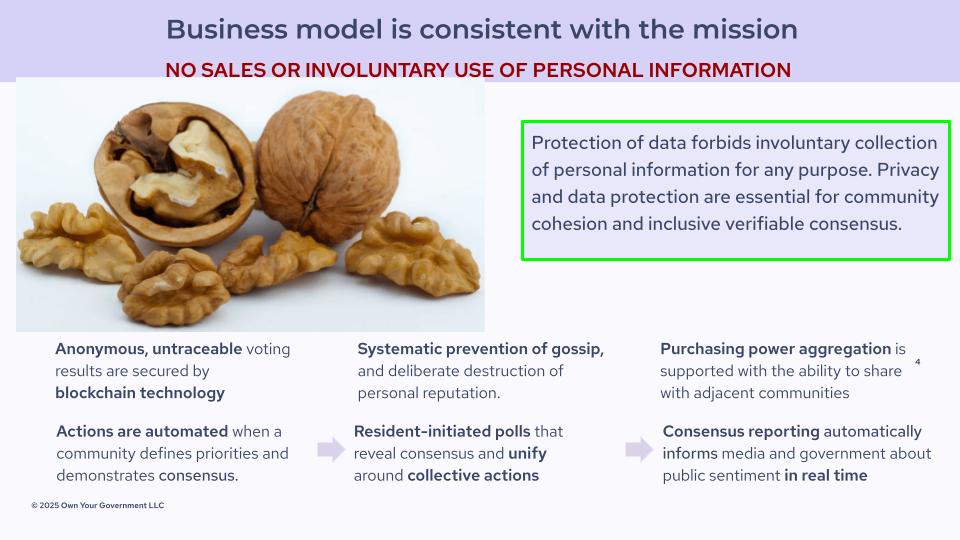 A community's OYG platform exists as encrypted data in redundant servers, with strong privacy protection of personal information, voting data and outcome of polls, using security procedures equal to financial institutions.